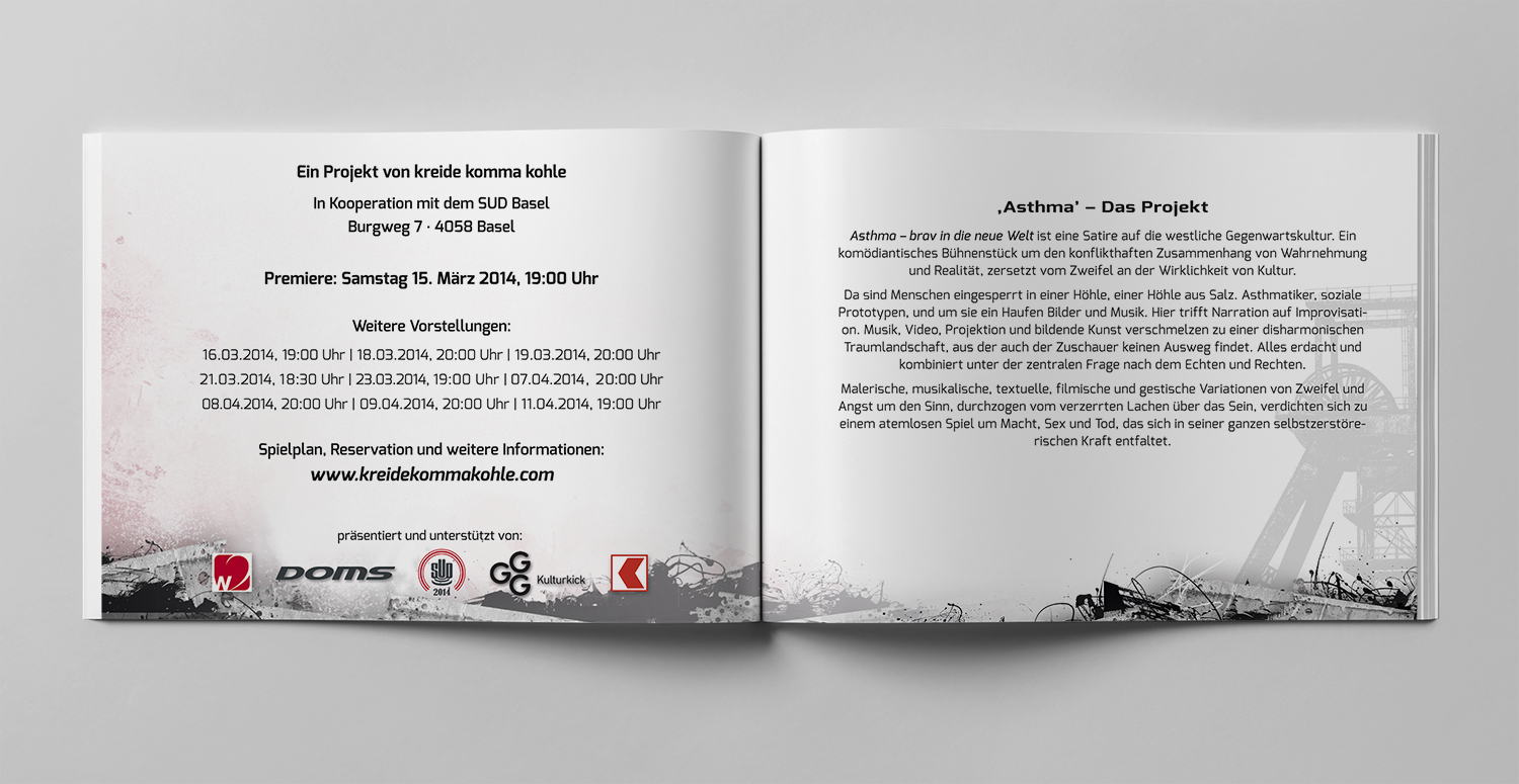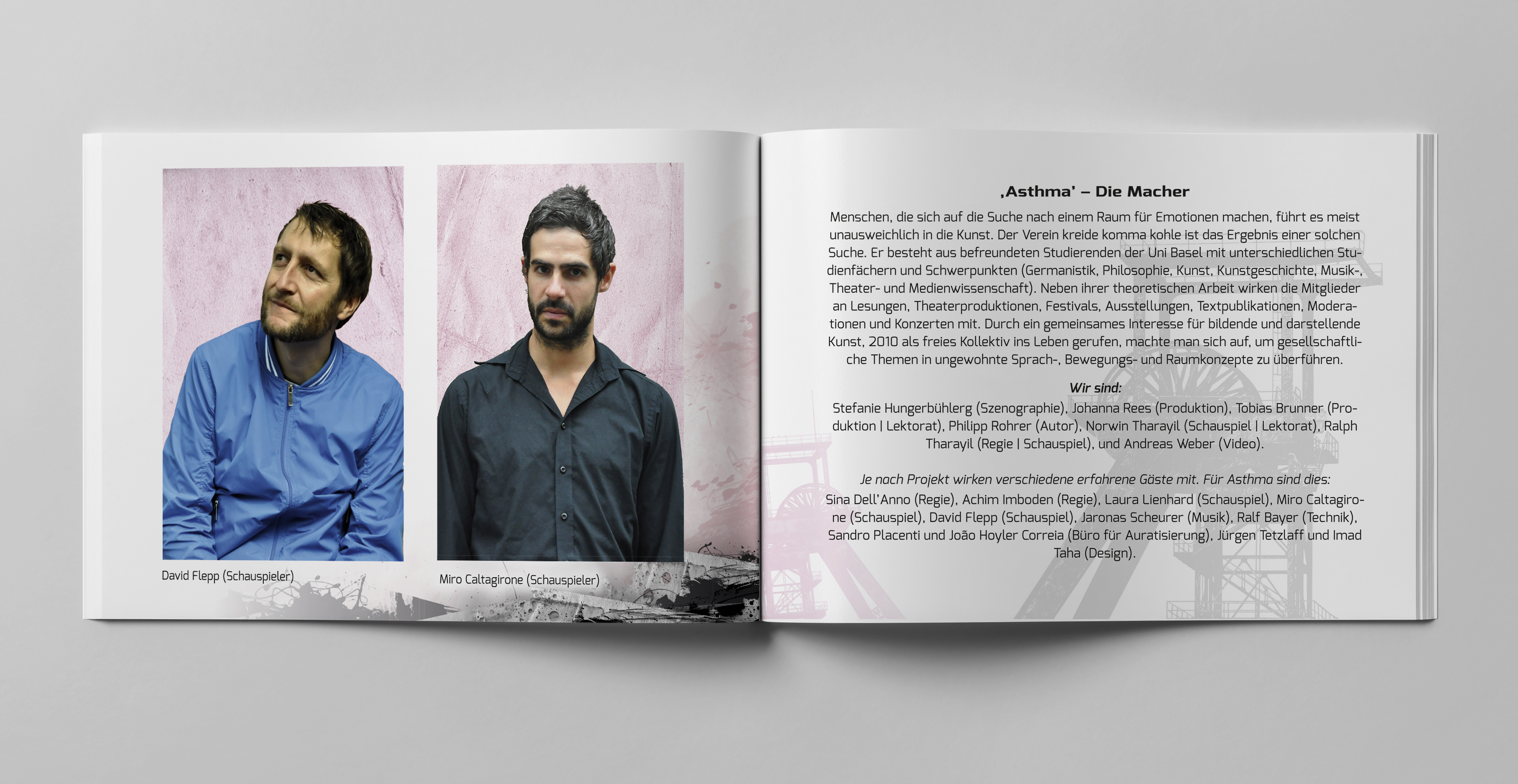Programmheft zur Theateraufführung "Asthma-Brav in die neue Welt" der Basler Theatergruppe KREIDEKOMMAKOHLE (2014) Seite 2 + Seite 3